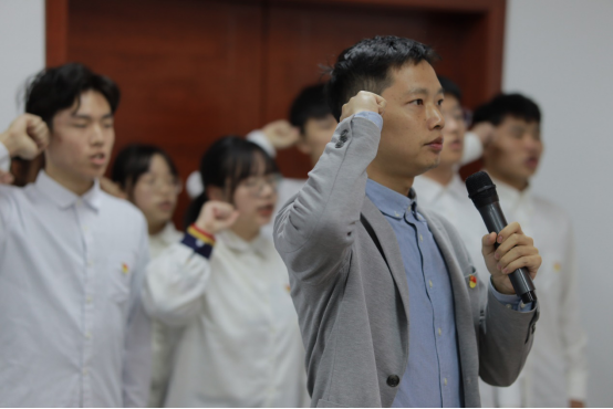 入党宣誓仪式在《中华人民共和国国歌》中拉开帷幕,仪式共有八项议程。徐丹宣读38名预备党员、23名正式党员批复后,全体预备党员在王学鹏的带领下面向党旗庄严宣誓。党员代表朱胜、新党员代表唐嘉翊、入党积极分子代表贺鸿凯,在发言中表示将不断提高思想觉悟,积极发挥模范先锋作用,努力实现人生价值。