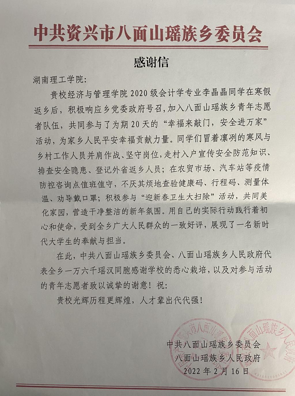 校园网讯 近日,经管学院收到一封来自中共资兴市八面山瑶族乡委员会的感谢信。来信详述了经管学院2020级会计学专业学生李晶晶在寒假返乡期间为当地疫情防控所做的努力与贡献,并对学校和学生本人致以诚挚的谢意。