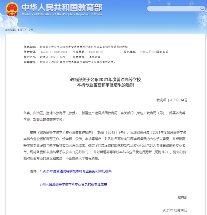 校园网讯 近日,教育部印发《关于公布2021年度普通高等学校本科专业备案和审批结果的通知》(教高函〔2021〕14号),信息学院申报增设的人工智能专业(080717T)成功获批。在此前的新增专业申报评审中获得教育部教指委6位专家的一致同意。