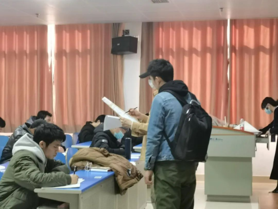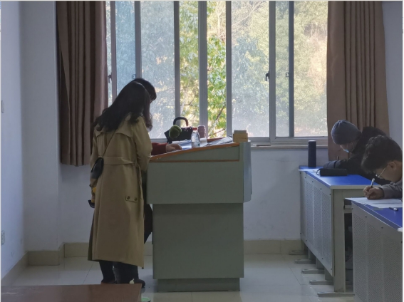 为确保考试顺利进行,徐丹及学工办老师早早抵达教学楼,清点信息学院学生考场人数,查看考场考风考纪状况,维护考场秩序。