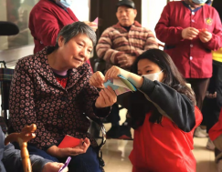 活动过程中学生党员与老人进行一对一组队,合作完成了各项游戏。在纸杯扣球环节,学生党员与老人高度配合,一个递球一个推球、一个递杯子一个扣球,激烈程度堪比大型运动会现场。在激烈的“交战”过后,大家围坐在一起,观看学生党员与老人带来的表演。现场一位98岁的奶奶情不自禁地跳起了舞,她说:“今天太开心了,看到你们就像是看到了年轻时候的我,我像你们这么大的时候新中国才刚成立......你们要不断的学习,活到老,学到老。”