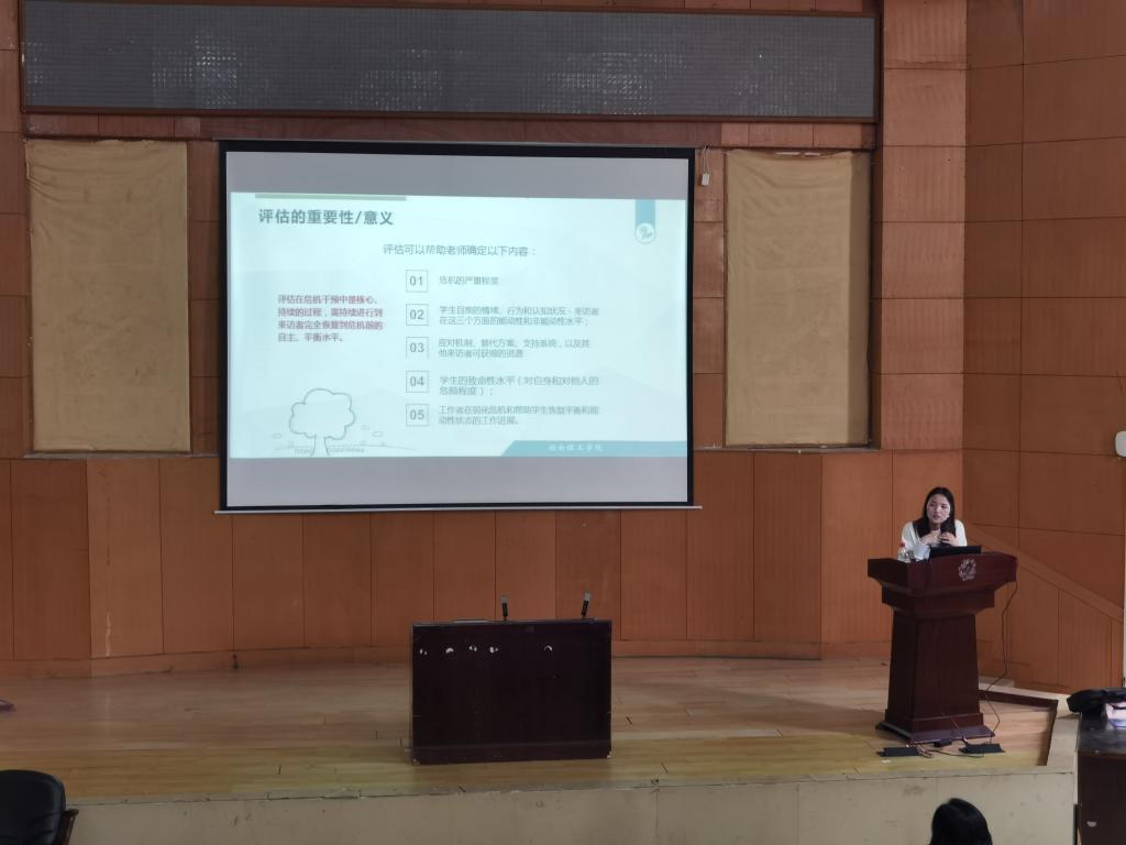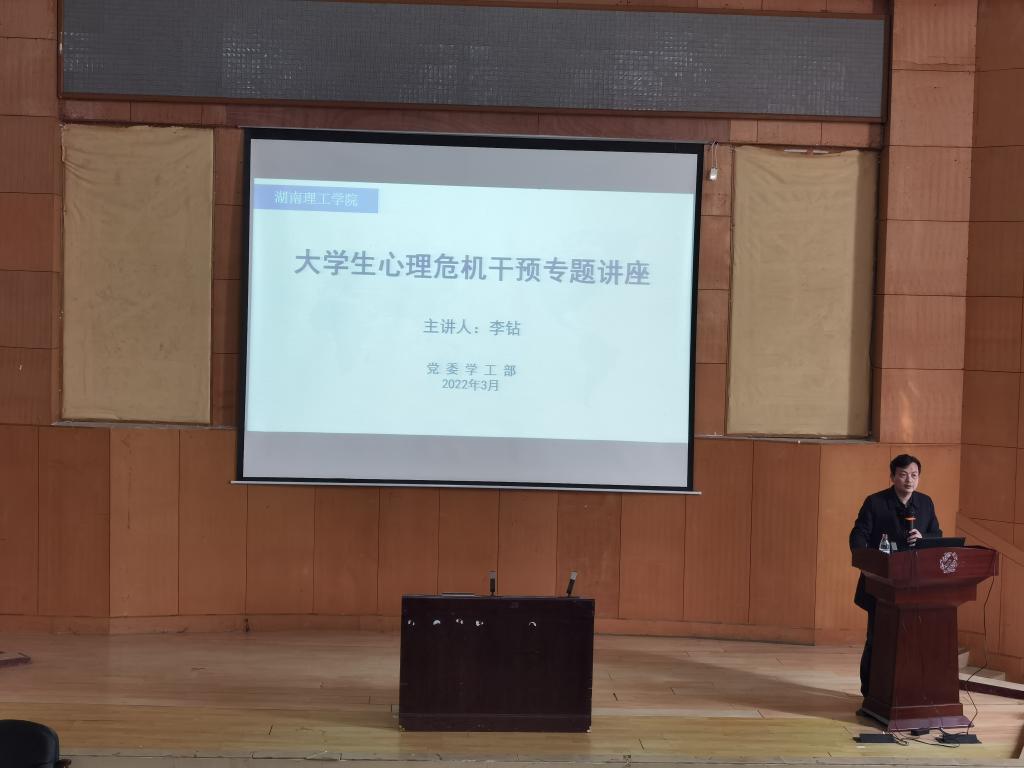 校园网讯 3月9日下午,党委学工部在东院综合楼学术报告厅举行大学生心理危机干预专题培训。党委学工部全体工作人员、各院(系)学生工作负责人、全体辅导员老师参加。本次培训由心理健康教育中心李钻老师主讲,学工部副部长毛伟主持。