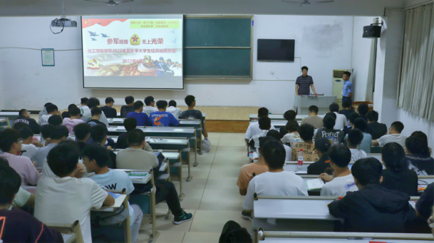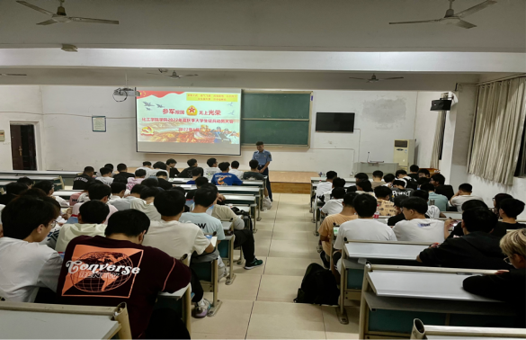 校园网讯 为宣传国家征兵政策,加强学生报效祖国、献身国防的热情,5月5日,化工学院于7T1、7T2举行了春季征兵政策动员大会,本次动员大会由毕业生辅导员段伟豪、退伍军官余长发、优秀代表赵克凡和朱锐主讲,21级全体男生与会。