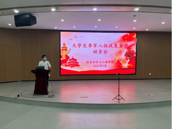 校园网讯 5月10日上午,信息学院在实验实训大楼17118会议室举行大学生参军入伍政策宣讲动员会。院党委副书记徐丹出席,学院有入伍意向的同学参加,会议由学院武装专干王学鹏主持。本次动员会开通线上同步直播,有入伍意向学生的家长线上参与。
