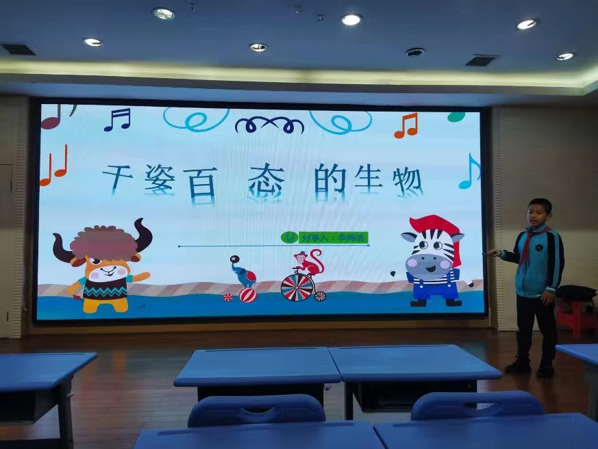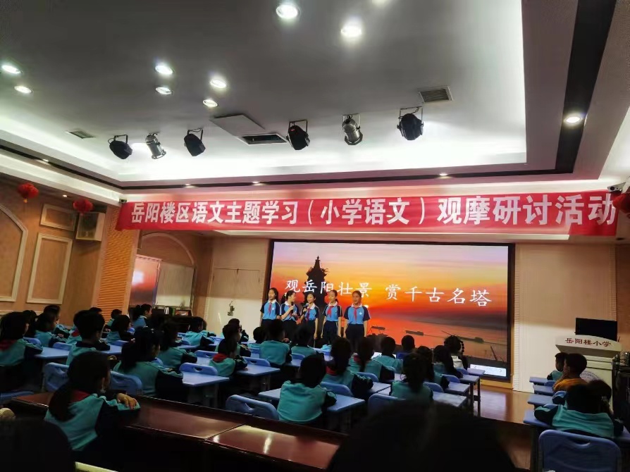 观摩研讨活动中,岳阳楼小学教师陈茜进行了汇报展示,她以“看我七十二变”为主题,围绕其开展的综合实践活动进行成果展示和经验分享。她将游戏理念赋予综合实践活动的课堂,强调学生主体、寓学于乐;两名岳阳楼小学六年级学生分别围绕“生物”、“花朵”的主题进行现场讲解。孩子们用精美的PPT向众人呈现其探究性学习的成果,稚嫩的童声中洋溢着知识的力量与自信的光芒;五名岳阳楼小学学生将课堂搬上舞台,围绕“观岳阳壮景,赏千古名塔”这一课题,以低年级为教学对象,开始了“小老师”授课。现场气氛活跃,形式新颖、效果甚好。