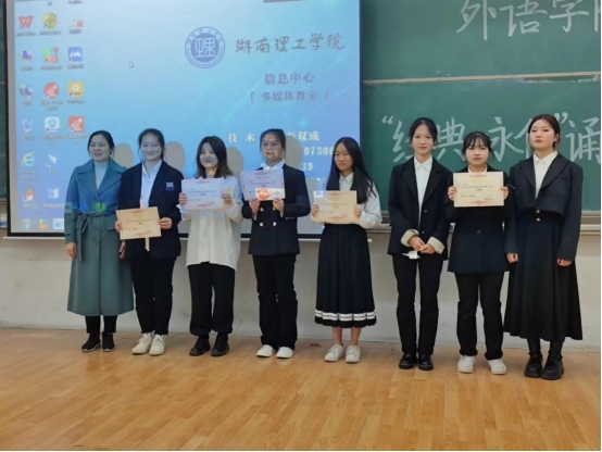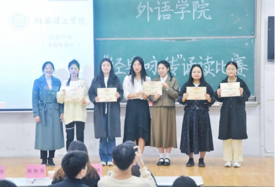 比赛渐近尾声,主持人宣布各参赛队伍与选手得分,并宣布最终比赛名次。经过现场评委细致公正的评分,共评出一等奖五名、二等奖六名、三等奖七名、优胜奖五名。吴静、石红芳、周伟芳分别为一、二、三等奖和优胜奖获奖小组和个人参赛选手颁奖。吴静针对参赛个人与小组做细致点评,并提醒学生,要多读经典,朗诵时要注意朗诵的节奏与语音语调。