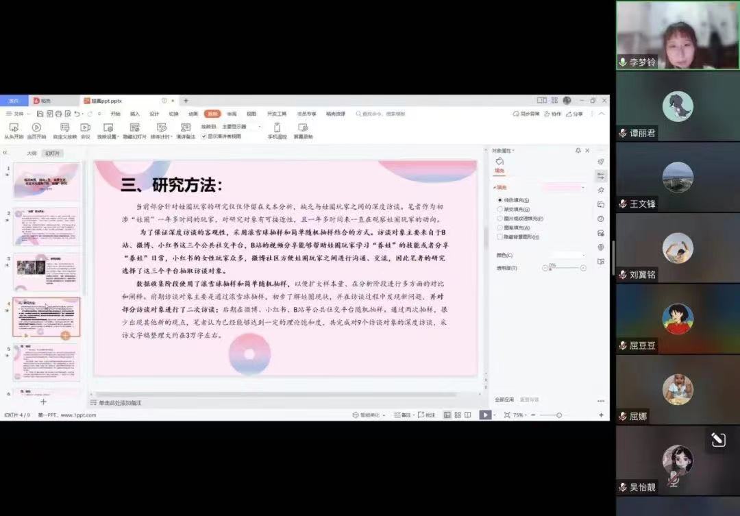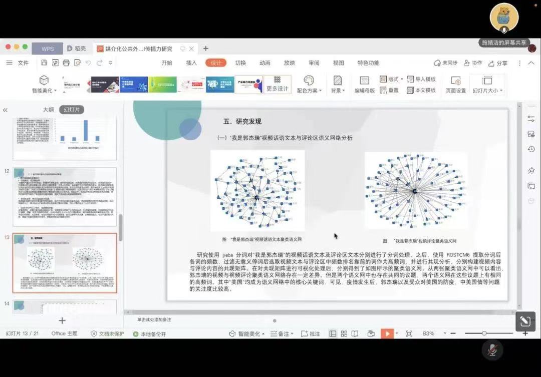会上,20位同学分别从论文的研究背景、研究意义、研究方法、研究结论等方面作了汇报。评委老师逐一打分和点评。
