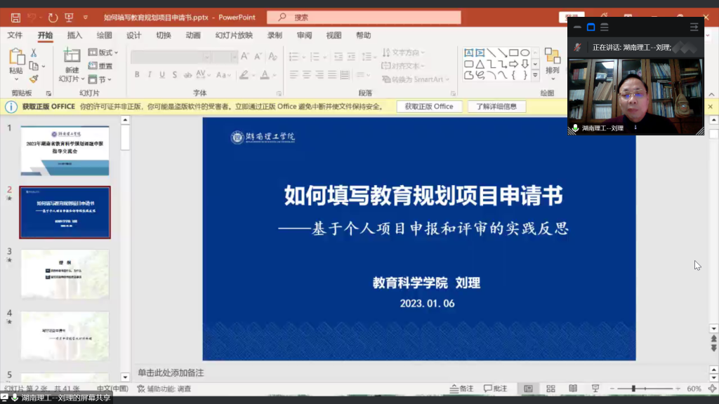 1月6日晚上,特邀教育科学学院院长刘理讲授《如何填写教育规划项目申请书》。刘院长基于个人项目申报和评审的实践经验,指出老师们申报书存在的共性问题,有针对性地提出修改建议。此外,他还梳理了系统填报的注意事项。