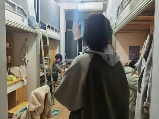助班在学生宿舍与学生交流