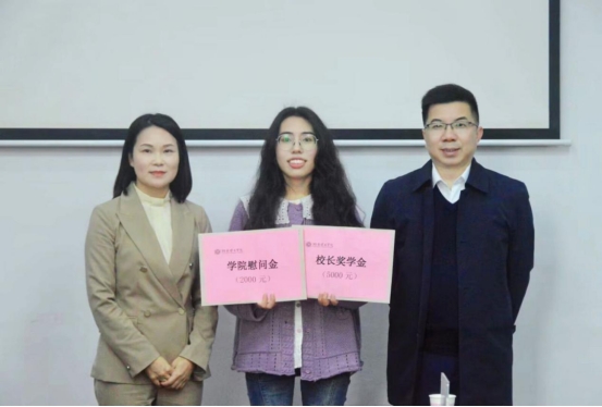 会议第二项,徐振祥和王敏共同为吴美玉同学颁发“校长奖学金”、学院慰问金。