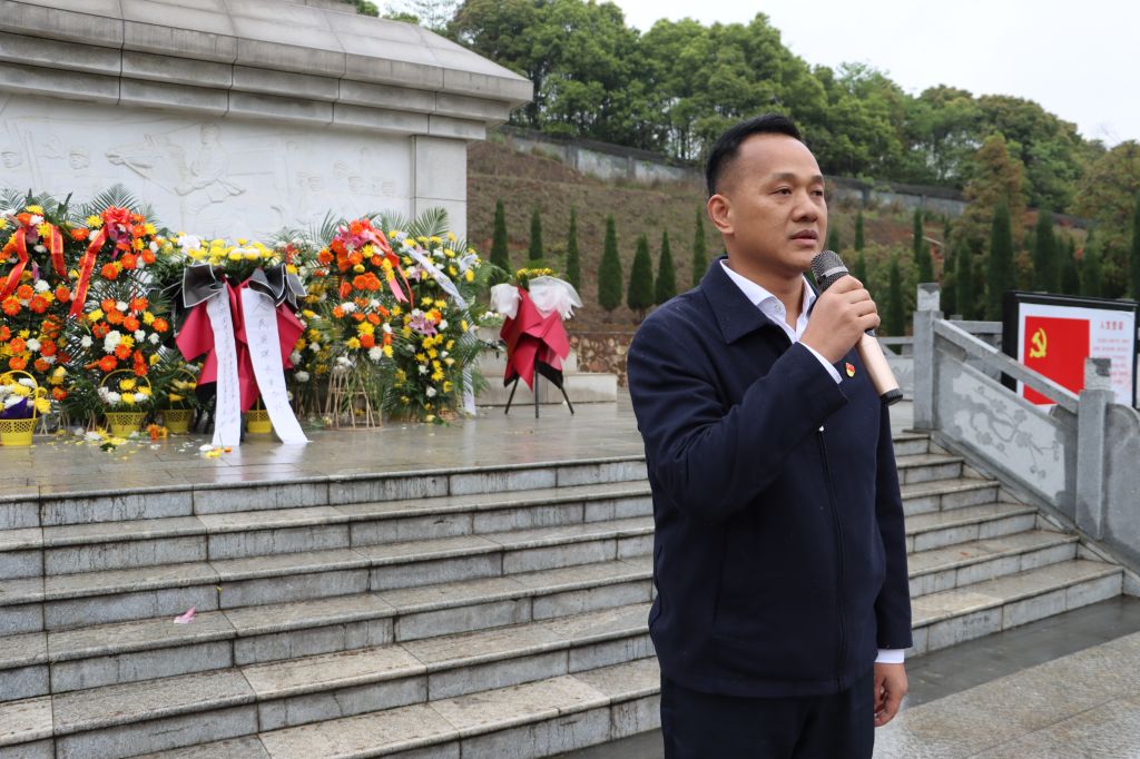 陈超文在革命烈士纪念碑前发表讲话。他表示,革命先烈们的英雄事迹、革命精神和光辉业绩永远值得我们缅怀和尊敬,他们对中华民族伟大复兴的坚定执着追求,并因此而舍生忘死的英勇献身行为,始终是激励我们奋勇前进的强大精神动力。我们祭奠英雄,就是要继承先烈遗志,弘扬先烈精神,传承先烈伟业。当代青年生逢盛世当不负盛世,生逢其时当奋斗其时,坚定理想信念,脚踏实地的做好每一件平凡的事,励志做一个有理想、敢担当、能吃苦、肯奋斗的新时代有为青年!