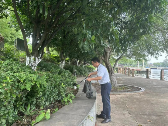 活动现场,师生们手持垃圾夹、垃圾袋等工具,将散落的枯叶、纸屑、烟头、塑料袋、饮料瓶等一一“收入囊中”。经过近一个小时的捡拾,湖岸一侧焕然一新。水面波光粼粼,晴空下,大家额间的汗珠闪闪发光。