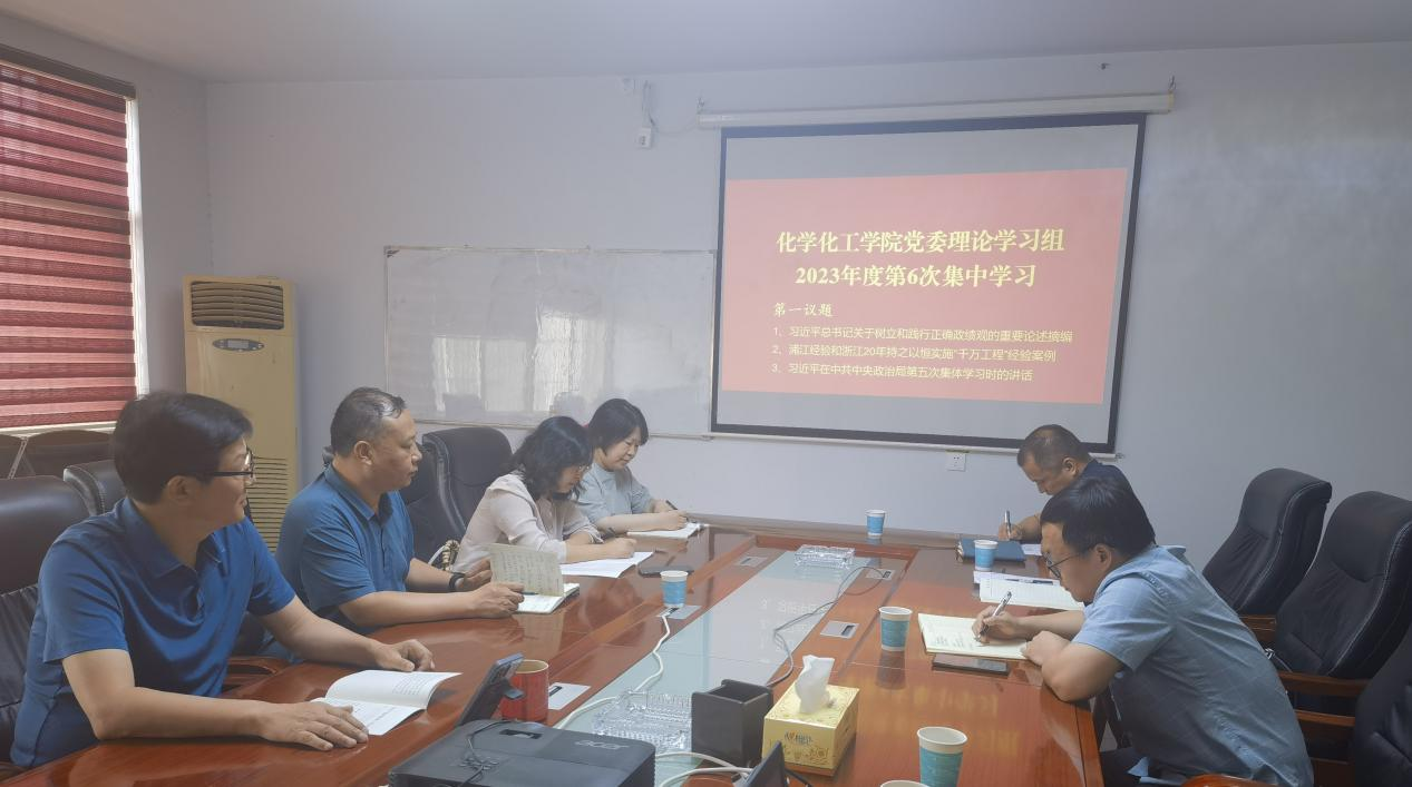 校园网讯 6月19日下午,化学化工学院在7301会议室召开党委理论学习组本年度第六次集中(扩大)学习会,就习近平总书记关于树立和践行正确政绩观的重要论述、浦江经验和浙江20年持之以恒实施“千万工程”经验案例、习近平在中共中央政治局第五次集体学习时重要讲话精神等议题进行了学习研讨。学院党委书记刘立刚主持会议。