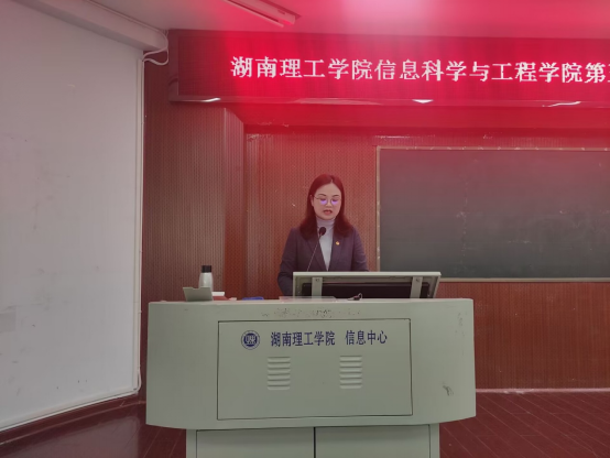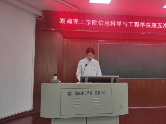 谷诗薇代表第四届学生委员会作工作报告。大会依次审议《共青团湖南理工学院信息科学与工程学院第四届委员会、学生委员会工作报告》《第五次学生代表大会代表资格审查报告》《第五次双代会选举办法(草案)》《第五次双代会总监票人、监票人、计票人名单(草案)》《第五次双代会委员会委员候选人名单》。