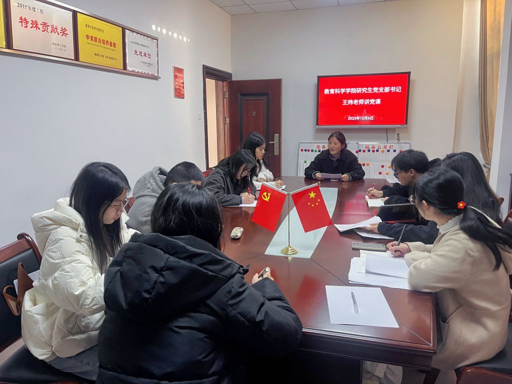 校园网讯 为进一步学习贯彻习近平新时代中国特色社会主义思想和党的二十大精神,进一步加强党员同志的责任与担当意识,12月6日下午,教育科学学院研究生党支部在综合楼314会议室开展党课教育,本次党课由研究生党支部书记王炜主讲,全体研究生党员同志参加学习。