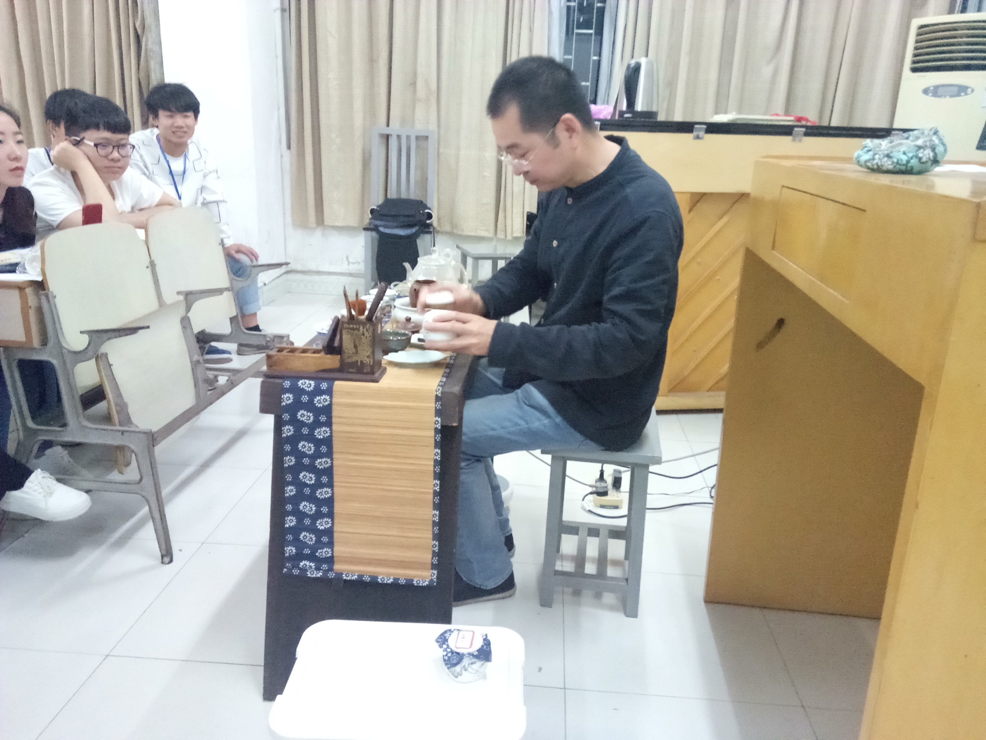 校园网讯 4月19日晚,三眼泉茶馆主人周木荣先生受音乐学院忧乐雅集社邀请,在音乐学院4202教室开讲“中国传统音乐雅集暨音乐人文大讲堂(第九辑)”,音乐学院教师张映兰参加并主持了此次活动,活动吸引了不少对茶道感兴趣的同学慕名而来。
