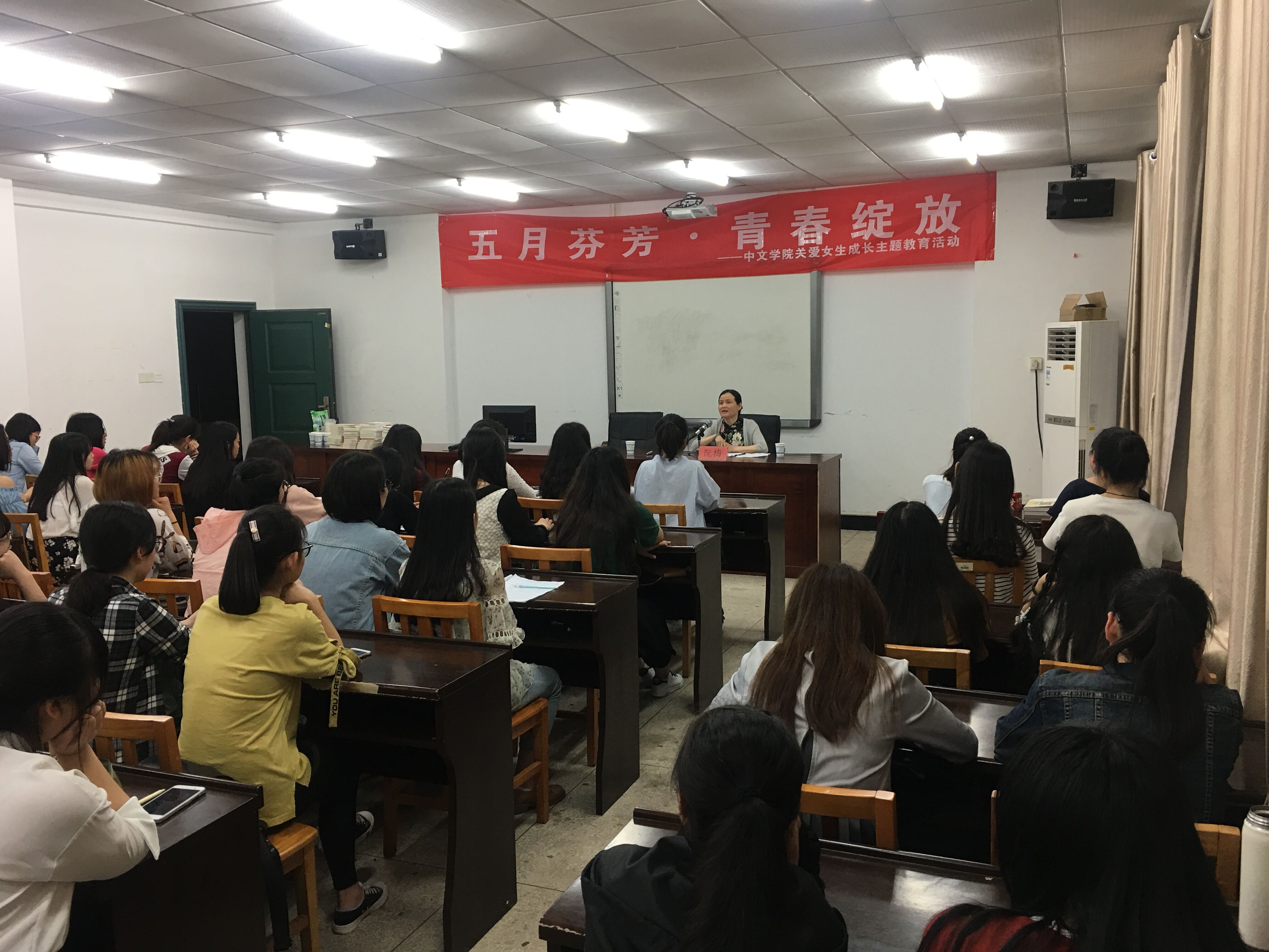 校园网讯5月10日晚,中文学院“五月芬芳·青春绽放”关爱女生成长主题教育活动暨“5•25”大学生心理健康教育活动月系列活动在9305举行。著名儿童文学作家、华容县文联主席、中文学院挂职副院长阮梅老师与中文学院女教师代表、女学生代表围绕“关爱女生成长”及文学创作开展交流。中文学院负责人出席。
