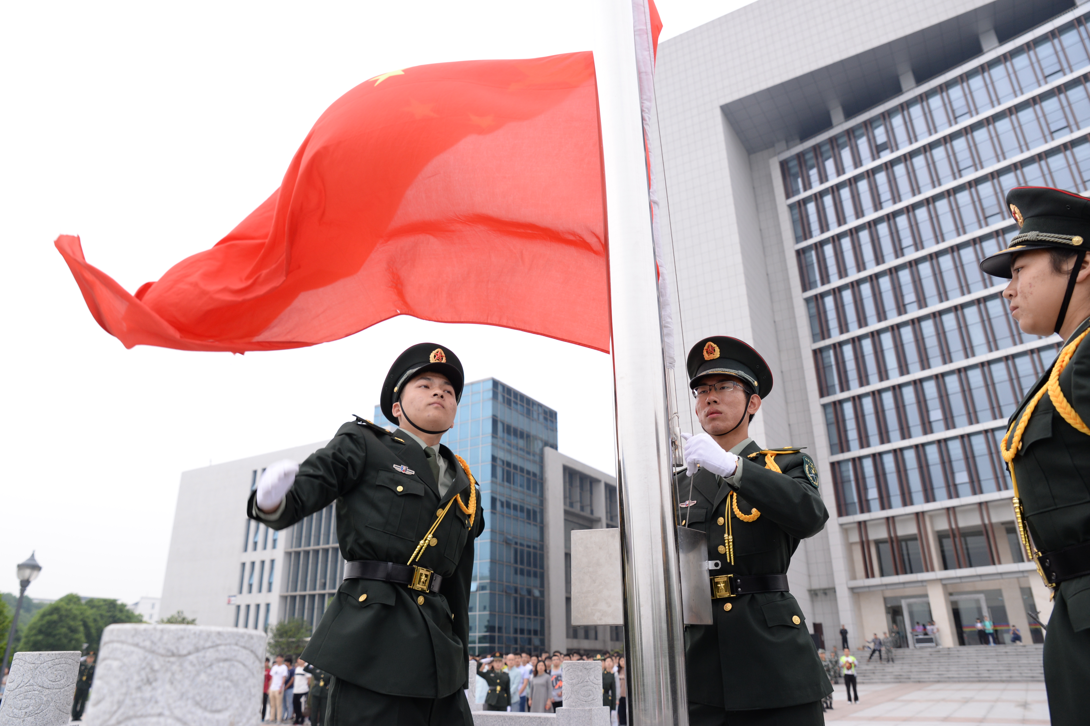 7点10,800余名师生列队完毕,学校国旗护卫队队员护送国旗入场,全场庄严肃立,随后,伴随着雄壮的国歌,五星红旗冉冉升起。
