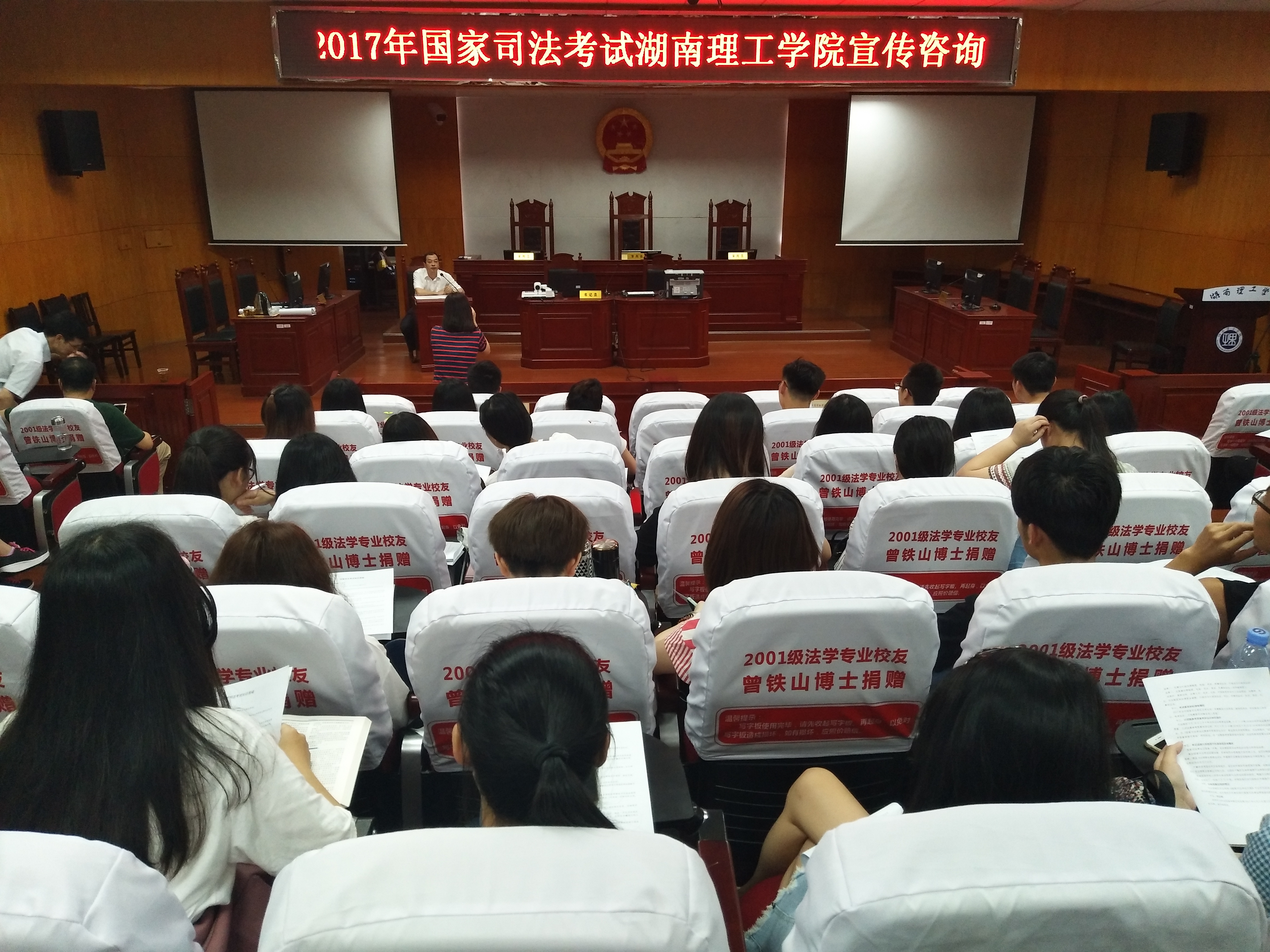 校园网讯 6月12日上午,我院在模拟法庭开展2017年国家司法考试宣传咨询会。政法学院特别邀请岳阳市司法局相关负责人作司考宣讲咨询。2014级法学专业的同学参加宣传咨询会。