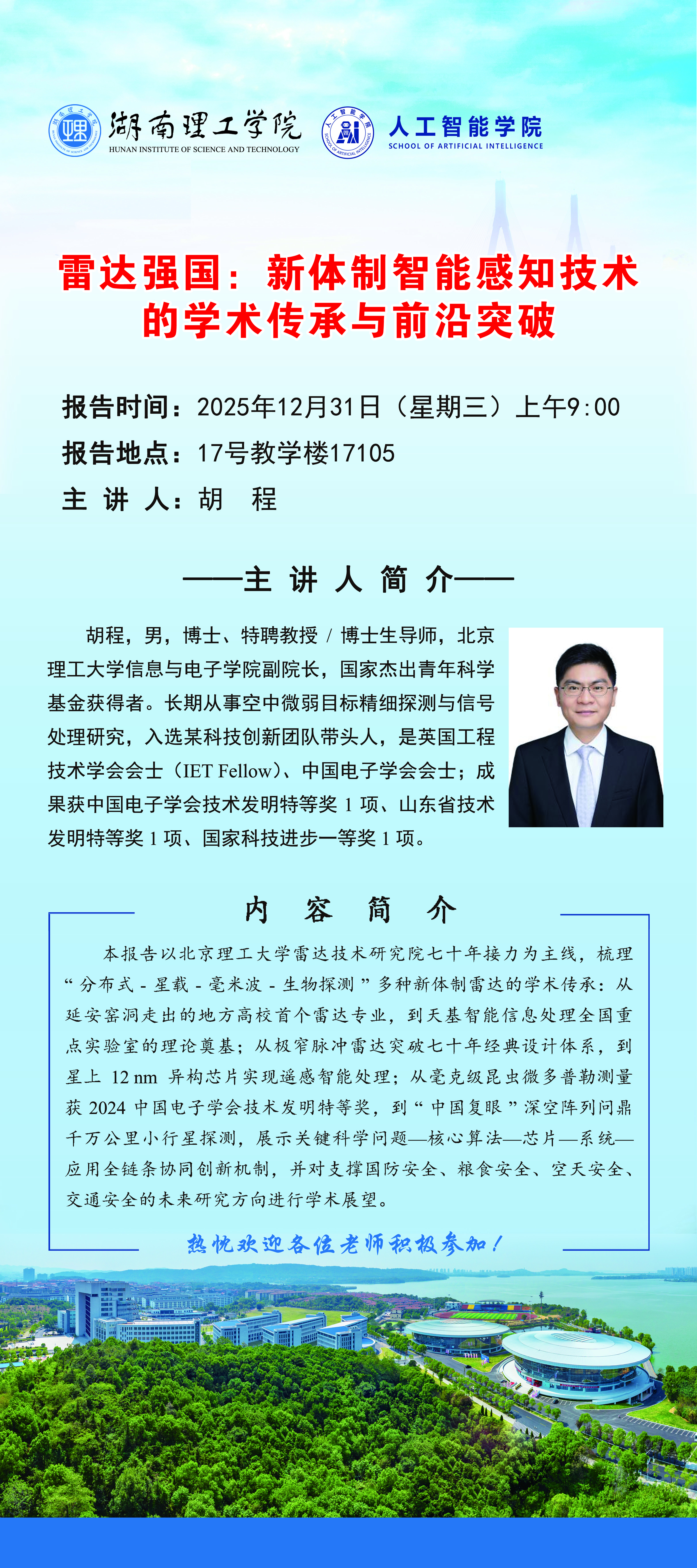 北京理工大学胡程教授“雷达强国:新体制智能感知技术的学术传承与前沿突破”讲座预告