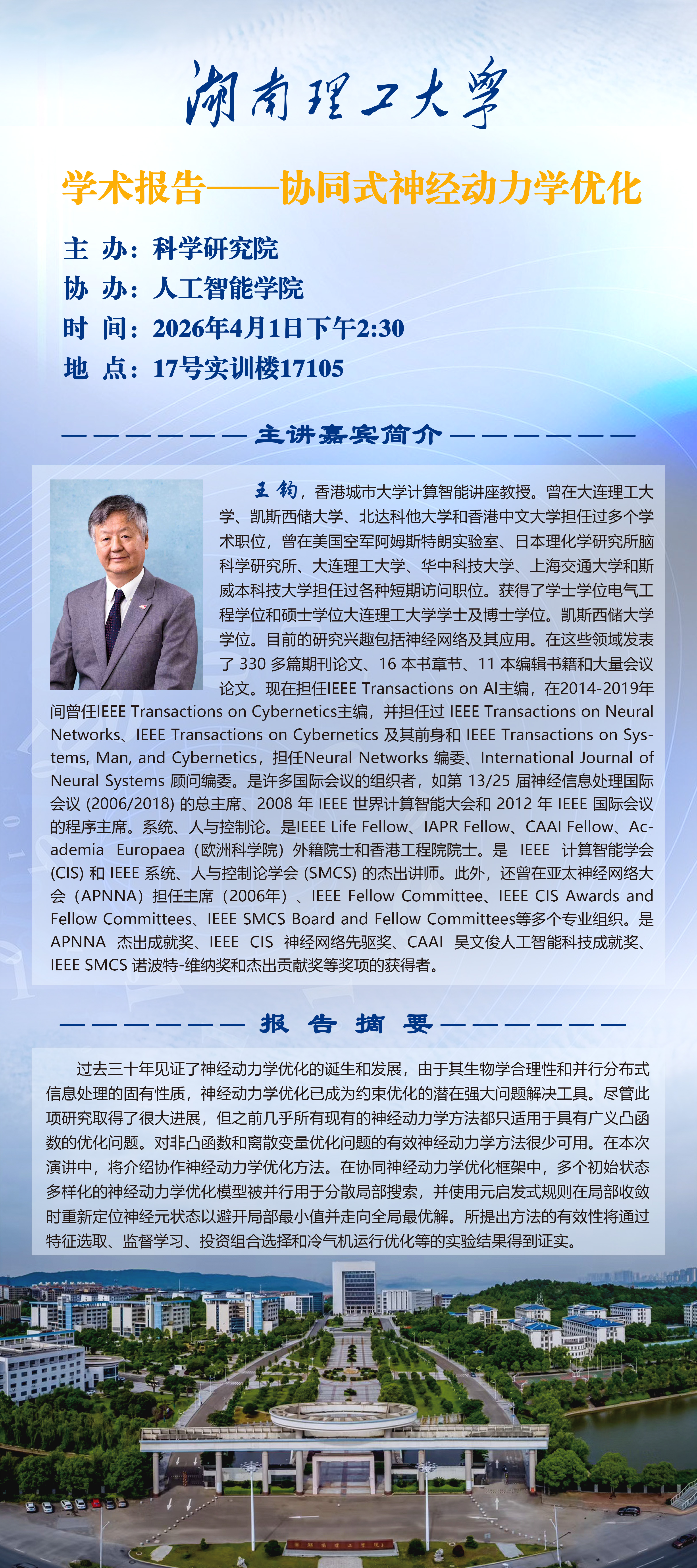 香港城市大学王钧教授“协同式神经动力学优化”讲座预告