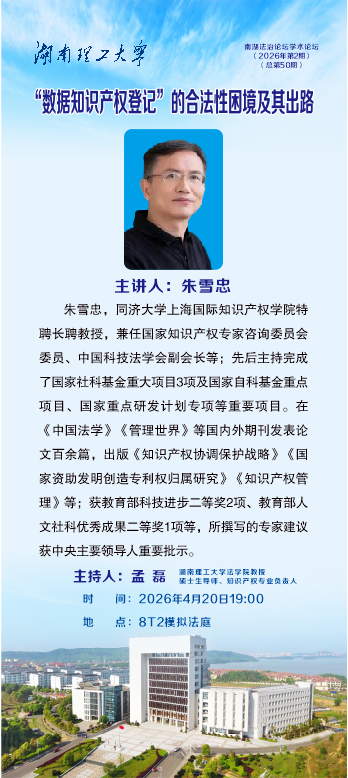 同济大学朱雪忠教授“数据知识产权登记”的合法性困境及其出路讲座预告