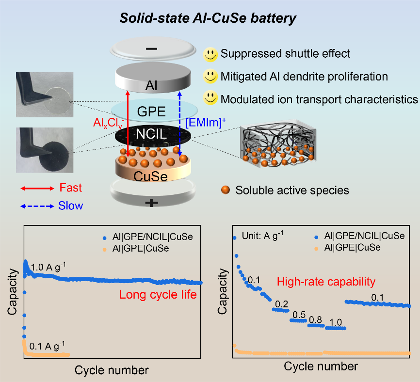 非水系可充电铝电池在大规模储能领域极具应用前景。然而,以金属铝为负极、氯铝酸盐离子液体为电解质、高容量金属硒化物为正极的传统铝电池体系仍然存在铝枝晶生长、活性物质穿梭效应等问题。该团队基于其固态铝电池的研究基础(Advanced Materials, 2025, 37: 2416755),创新构建了“三明治”式固态电池架构,在凝胶聚合物电解质与CuSe正极之间策略性地植入离子/电子双导电夹层(NCIL)。实验研究和理论计算结果表明,合理设计的NCIL具有三重功能:(1)可有效限制可溶性中间体的产生,提高活性物质利用效率;(2)通过增加阴离子转移数实现离子传输特性的调节,从而促进电极反应动力学;(3)抑制铝枝晶生长。0.1 A g-1电流密度下,该固态Al-CuSe电池可提供1438 mAh g-1的超高比容量;1.0 A g-1电流密度下,该电池的稳定循环寿命超过5000次。该成果提出的基于协同电解质/电极界面优化的界面工程策略,为开发长循环寿命、高能量密度的铝基储能系统建立了一种新的范式。