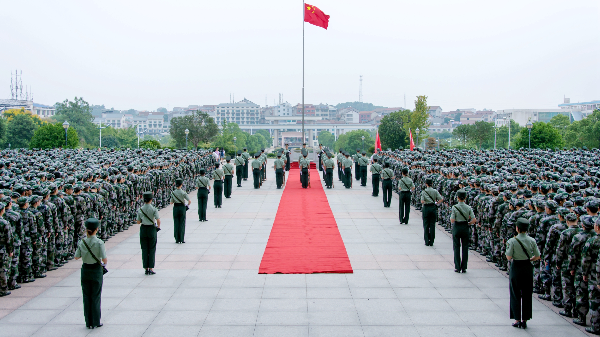 7时5分,升旗仪式正式开始。学校国旗护队成员步伐一致,气宇轩昂地走向升旗台,2019级新生在护旗队两侧整齐呈方阵站立。在激昂的《义勇军进行曲》中,升旗手振臂一挥,鲜艳的五星红旗徐徐展开。迷彩的海洋泛起一阵浪花,2019级新生的目光齐齐在国旗上凝聚。全体人员肃立行注目礼,向庄严的国旗表达最崇高的敬意。