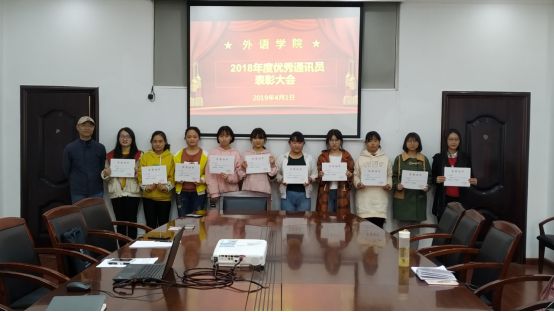 校园网讯 4月1日下午,外语学院于8103会议室举行2018年度优秀通讯员表彰大会,由学院宣传专干申晓丽老师主持,学院党总支书记潘洞庭、副书记石红芳出席会议,全体通讯员参加。会上,潘洞庭老师为马树英等10位优秀通讯员颁奖。同时,对通讯社2018年度做出的成绩加以肯定和表扬,又提出了其中的不足。他指出:新闻稿应该要求出稿速度快,必须及时;希望通讯员多看优秀新闻稿,学习并借鉴写作技巧,避免细节错误的出现。申晓丽再次...