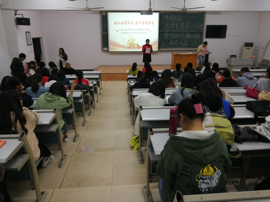 校园网讯 4月28日下午,外语学院于8T1召开大学生课前三分钟爱国朗读(第三季)动员大会,会议由学院党总支副书记石红芳主讲,全体辅导员出席。活动中,石红芳解读了关于举办“献礼祖国华诞 放飞青春梦想——大学生课前三分钟爱国朗读(第三季)”活动的通知,呼吁在场学生起到良好的带头作用,积极参与课前三分钟的朗读活动,调动学生的积极性。辅导员殷成韵强调了公共课的课前三分钟朗读问题,就各位学生的值班时间和值班...