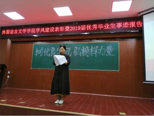 校园网讯 5月30日晚,外语学院在6号楼学术报告厅举行学风建设表彰暨2019届优秀毕业生事迹报告会,本次活动的主持人是肖洋,外语学院党总支副书记石红芳及全体辅导员老师出席会议,获奖学生代表、外语学院2018级全体学生参与本次活动。大会上,石红芳宣读学风建设方面的各类表彰文件,并进行了颁奖,石红芳、申晓丽、贺雯、徐江海和殷成韵等老师依次为获得“国家奖学金”“国家励志奖学金”“三好学生”“三好学生标兵”“省...