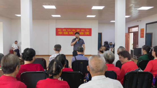 离退中心副处长余长庚在讲话离退中心中处长吕敬文和刘庆桂老师离退中心总支书记魏云辉和毛全周老师歌舞协会会长李敏生老师致辞歌舞协会副会长曹广庚老师主持会演东院舞蹈组:《我和我的祖国》西院廖德光老师男声独唱:《喀斯嘎尔女郎》南院闵和顺二胡独奏:《二泉映月》东院女声小组唱:《家乡恋歌》西院男舞蹈组:《我和我的祖国》东院小组唱:《红梅花儿开》西院马致谦等五人散文诗朗诵:《短,很短》东院男生小组唱《总想...