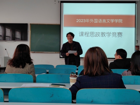 校园网讯 3月28日下午,外语学院于8410教室开展2023年课程思政教学竞赛学院初赛活动,由外语学院副院长邹娟娟主持,全体老师出席,部分学生受邀参与。活动伊始,参赛教师吴华玲、杨天麟、余凤梅、王欢、刘浩按照课程思政教学竞赛要求依次上台进行限时十五分钟的思政授课。五位老师以自身专业课程开展教学,将思政教育与立德树人融入教学中,赋予语言教学思政课堂创造力,表现力和亲和力。吴华玲老师展示翻译课程思政教学杨天麟...