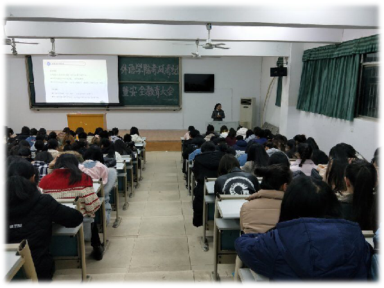 校园网讯 12月26日晚,外语学院于8T1教室举办考风考纪暨安全教育大会。15、16、17级同学参加本次会议。在本次会议中,各个年级辅导员老师主要针对考风考纪与安全教育两个方面进行指导,着重强调了考试过程中的相关工作及注意事项;通过对网络上及生活中的真实案例的阐述,落实安全教育的首要性及重要性。其次,老师们对寒假社会实践及放假、开学时间等相关事宜进行安排。(责编/潘星羽