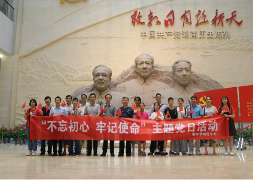 为深入学习党的十九大精神,值中国共产党成立97周年之际,数学学院党总支于2018年7月1日组织全体教师党员参观党史陈列馆、雷锋纪念馆和杨开慧故居,开展“不忘初心,牢记使命”主题党日活动。党史陈列馆以“敢教日月换新天”为主题,共分成四个部分:前三部分按照历史发展脉络,分别以“开辟新天地”、“描绘新画卷”、“谱写新篇章”为题,展现了中国共产党领导湖南人民革命、建设、改革的三个历史时期;第四部分“三湘群英...