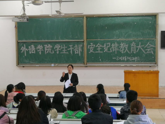 校园网讯 10月29日,外语学院在8T1教室召开外语学院学生干部安全纪律教育大会,外语学院党总支副书记及全体学工办老师出席,外语学院全体学生干部参加。会上,外语学院党总支副书记石红芳向全体与会人员讲述学校最近发生的安全事故,从外出游玩,传销,网络刷单,贷款,寝室安全等方面着手,用真实的案例告诫同学们要注意自身安全。在场的全体学生干部表示将会以身作则,发挥学生干部的带头作用,提醒身边的同学注意自身安全。...